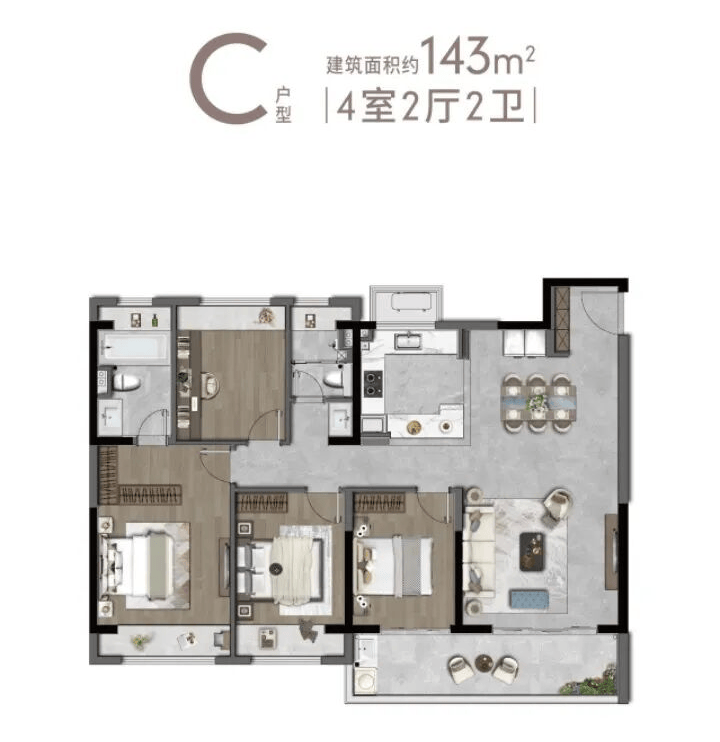 143㎡四室两厅两卫约379万约2.65万元/㎡中西双厨设计,餐厅可容纳10人圆桌