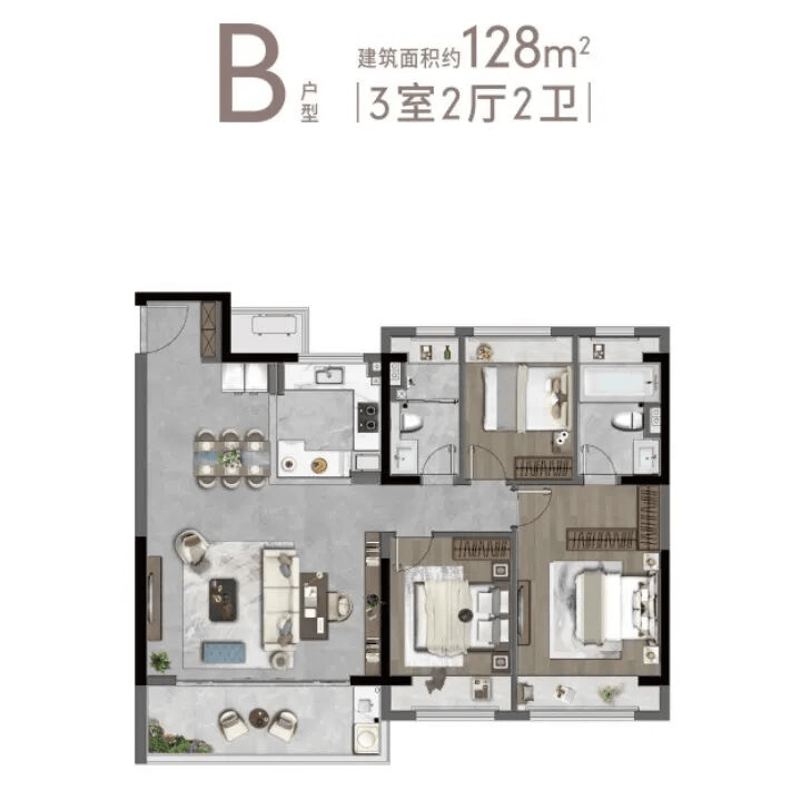 128㎡三室两厅两卫约339万约2.65万元/㎡6米观景阳台,主卧独立衣帽间