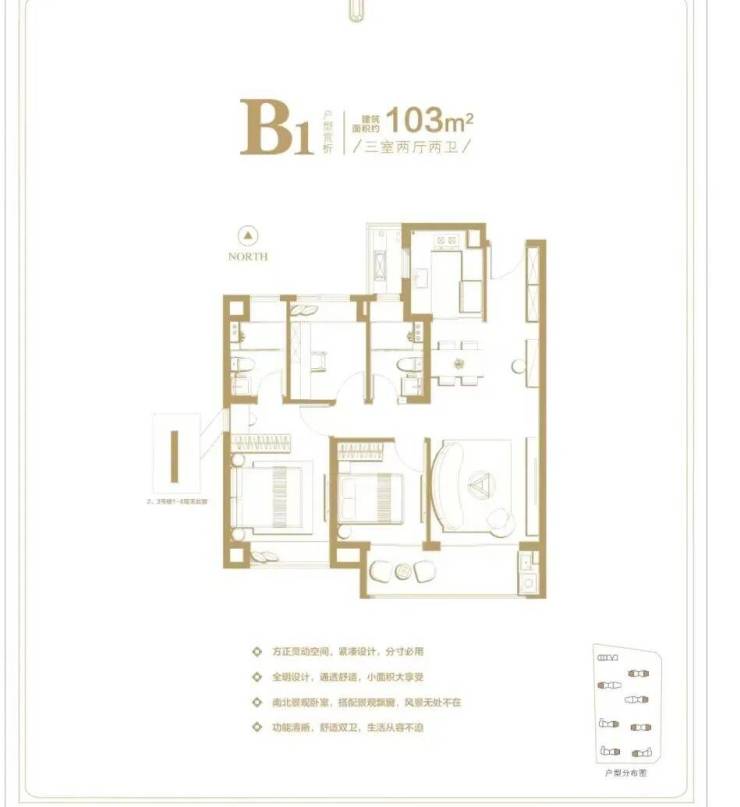 103㎡三房两厅两卫:全明格局,主卧套房设计,独立卫浴+衣帽间,空间利用率高
