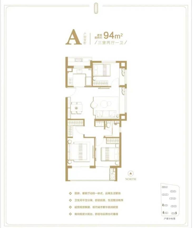 94㎡三房两厅一卫:三开间朝南,南向大阳台,得房率约76%,适合小家庭或年轻夫妻