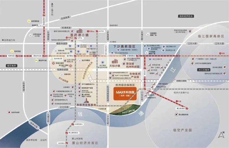 MAX科技园位于杭州综合保税区内,周边商务配套醇熟。钱塘区块定位为"世界级智能制造产业集群、长三角地区产城融合发展示范区",聚焦"跨境电商+生物医药+智能制造"千亿级产业集群