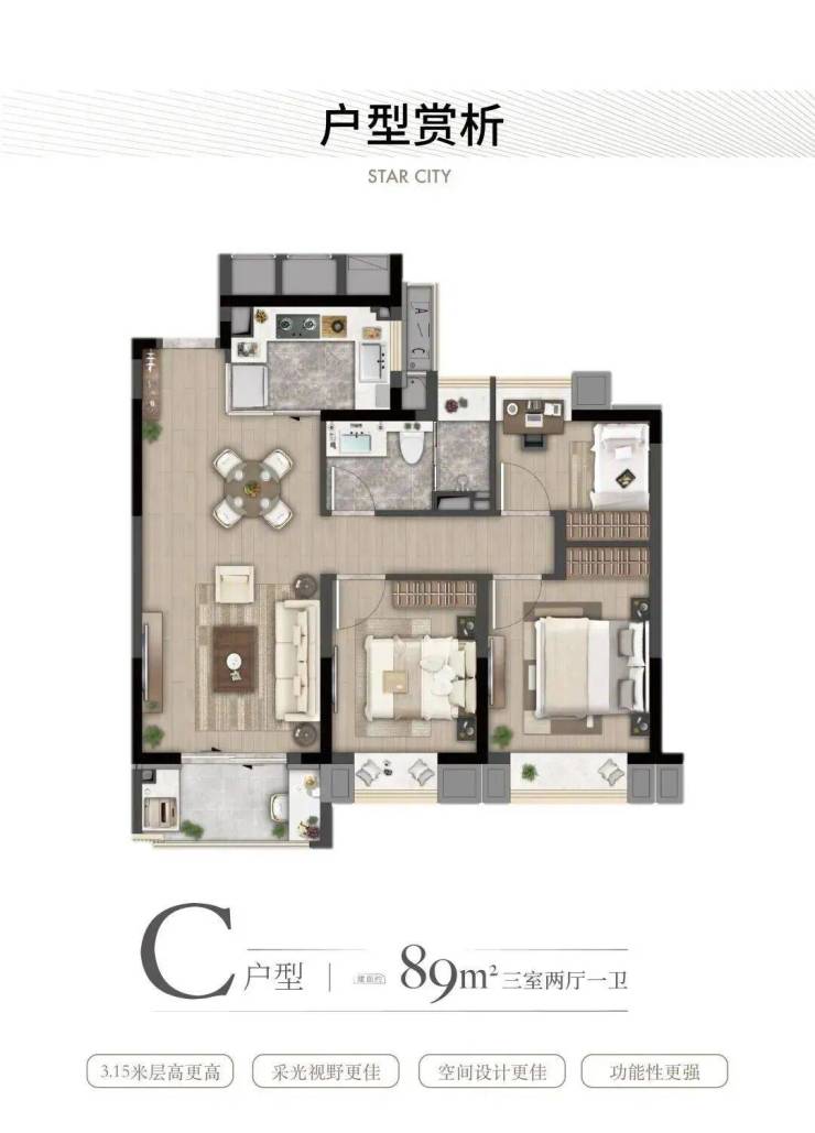 72-88㎡两至三房:方正全明格局,适合刚需客户。72㎡户型采用动静分区设计,配备观景飘窗;88㎡实现三开间朝南,U型厨房操作台长达4.8米,空间利用率极高。