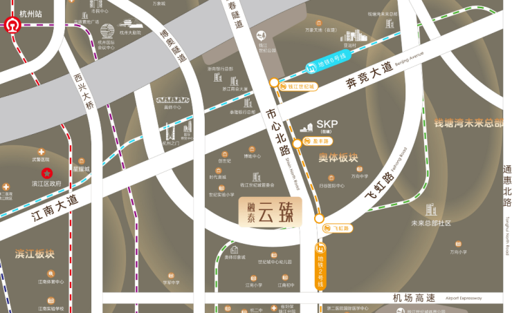 项目傲领钱江世纪城奥体核芯,东临市心北路,南侧飞虹路,坐拥“2横3纵3隧道4铁”交通便利,高效通达长三角及世界各大重要城市。