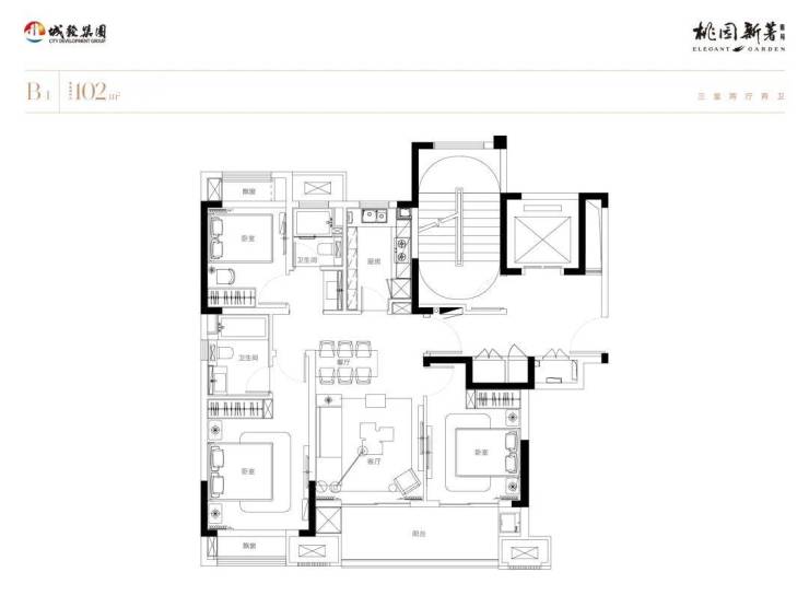 主力在售为 102㎡精装洋房(三居室)及 134/143㎡毛坯叠墅(四居室)