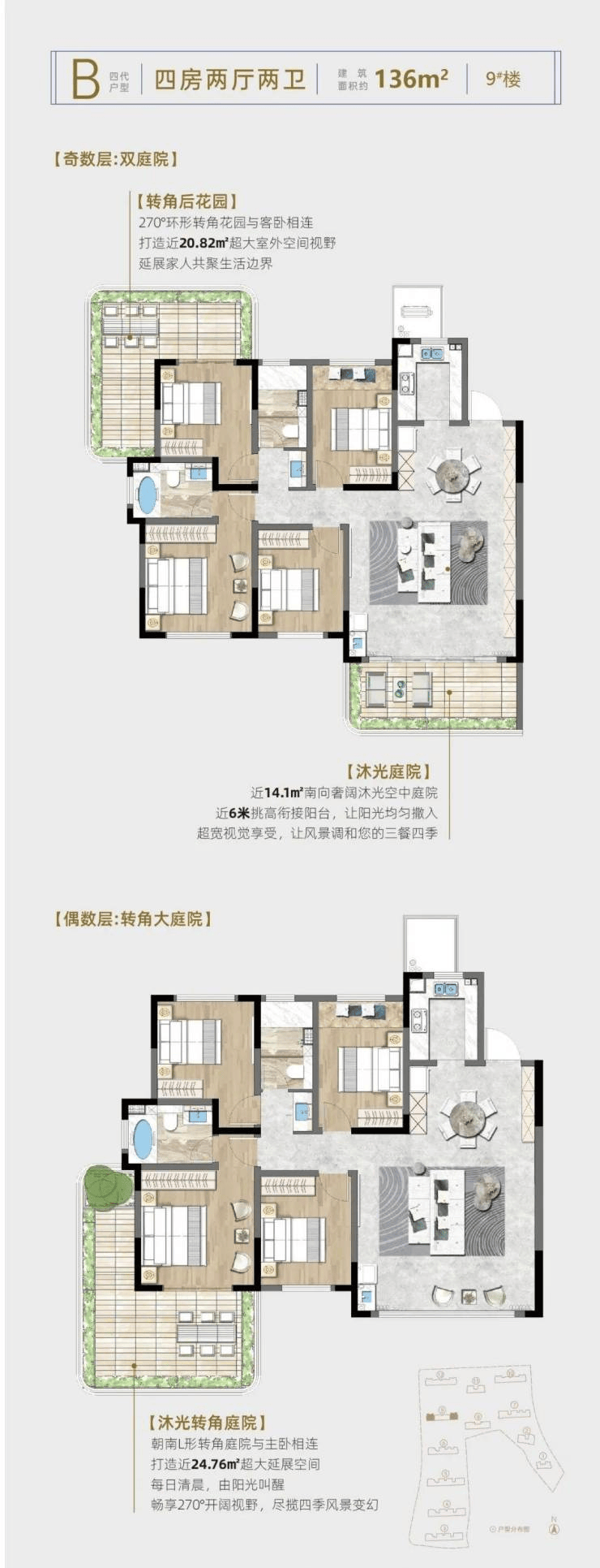 四代住宅:部分楼栋推出四代住宅,如9#楼奇数层带空中庭院,偶数层带转角大庭院,层高3米或3.15米,空间利用率高
