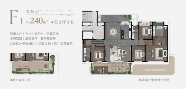 •湖居+四代宅的双重稀缺组合,规划建面约150㎡-240㎡低密奢阔大平层,板块内首个湖居四代宅产品,实际使用得房率约100%。