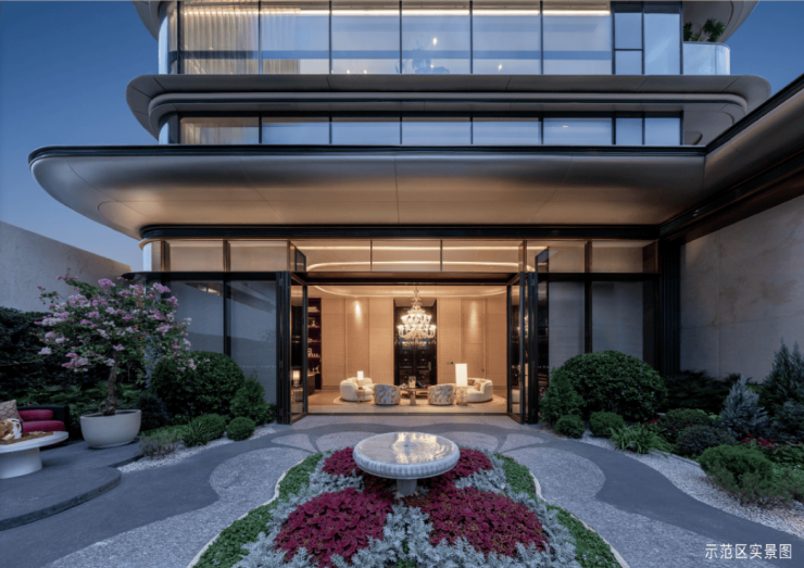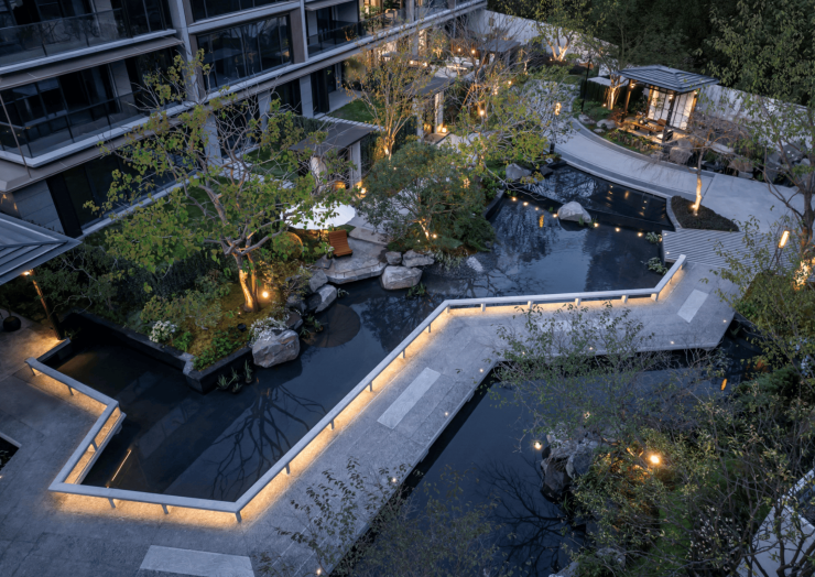 项目首创“两芯一轴多院落”布局,以中央溪谷水景轴串联三大组团,融合莫奈花园、台地景观、镜面水池、加拿利海枣阵列(单棵价值超8万元)。