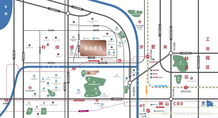 对于有自驾需求的居民来说,泉山雅境花园周边的自驾路网条件堪称得天独厚。项目紧邻通浒路、太湖大道,这两条城市主干道宛如两条交通大动脉,贯通潇湘路和中环西线、北线,为自驾出行提供了极大的便利。通过通浒路和太湖大道,居民可快速连接城市其他区域,实现快速通勤,轻松前往科技城和苏州其他重要区域。此外,项目东向约 3.3 公里是沪霍线,可上中环北线和中环西线,进一步拓展了出行范围。无论是前往苏州主城区感受繁华的商业氛围,还是奔赴周边风景秀丽的旅游景点享受休闲时光,都能凭借这发达的路网快速抵达,大大提升了出行的效率和便捷性。