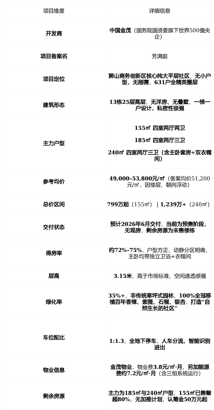 💡 购房提示 :狮山金茂府为 预售新盘无交付风险 ,但需注意 毛细管网系统存在极低概率渗水风险 (已有个案反馈), 装修不可拆改墙体物业+能源费合计约11元/㎡/月 ,适合 预算充足、追求科技舒适、不介意长期运维成本的改善家庭