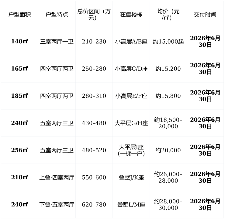 得房率 :约 78%–82% (高层),叠墅因赠送庭院/露台,实际使用面积更高