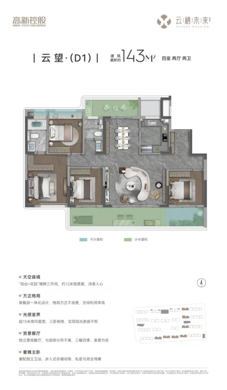 高得房率:125-165㎡四房户型,得房率83%-95%,南向双面宽设计,空间通透。