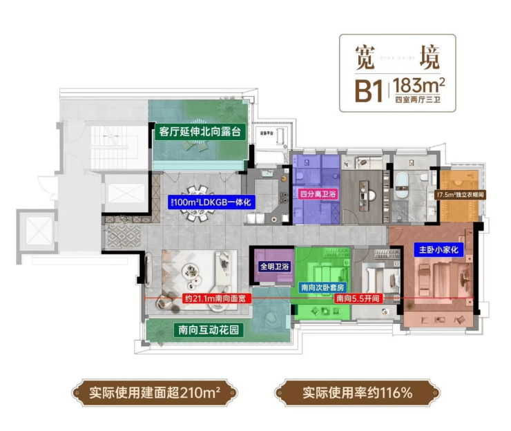 主力户型:143㎡、178㎡、215㎡ 四室户型,得房率超80%,全明通透,南北双阳台,无暗卫