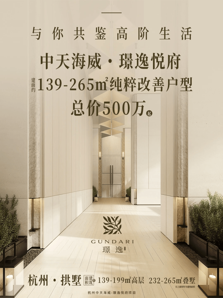 中天海威·璟逸是杭州拱墅区华丰板块的高端改善型住宅项目,由中天美好集团与海威置业联袂打造,定位为“主城封面级作品”,主打建面约139–190㎡的高层住宅及232–265㎡的叠墅产品,均价约35782元/㎡,总价区间475.84万–604.04万,精装交付,预计于2028年2月28日分批次交付。400 998 3632中天海威·璟逸营销中心电话