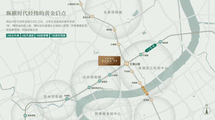 享受着上海最便捷的「交通路网覆盖」,顶流核心商圈快速通达。外滩曜出门即达18号线平凉路站,直线约800米直通北横通道;外滩启PARK77是12/18号线双轨交汇上盖。