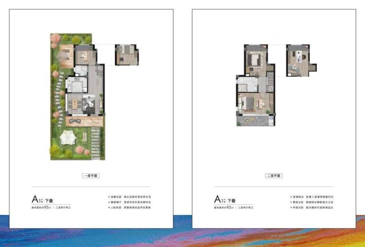95㎡下叠:三室两厅两卫,带50–90㎡私家庭院,适合三代同堂或亲子家庭,庭院可改造成菜园、烧烤区、宠物乐园;