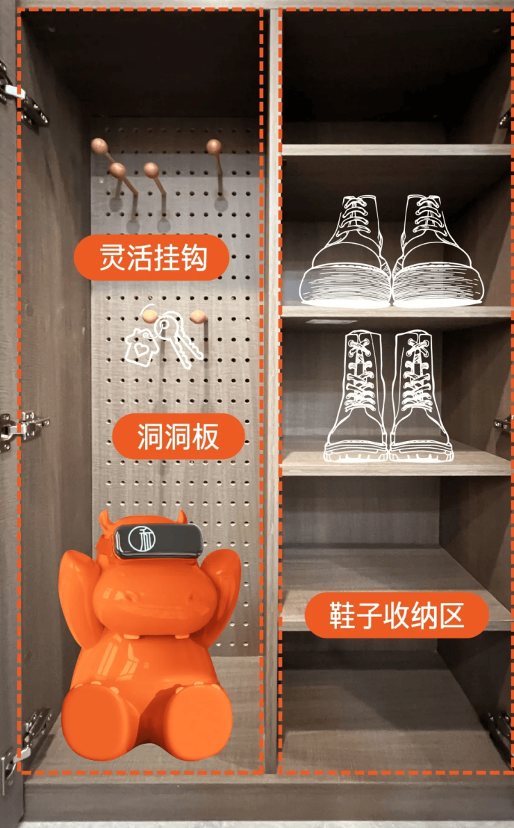 柜底悬空设计,家人拖鞋可收纳至柜底区域,让空间更加井然有序,生活更见品质。