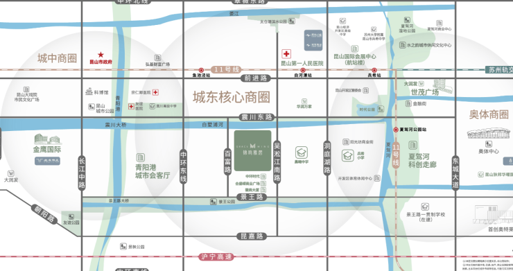 自驾网络 :紧邻娄东路、吴淞江路、前进东路、中环东线等主干道,15min直达昆山主城,25min至苏州工业园区,50分钟至上海虹桥枢纽。