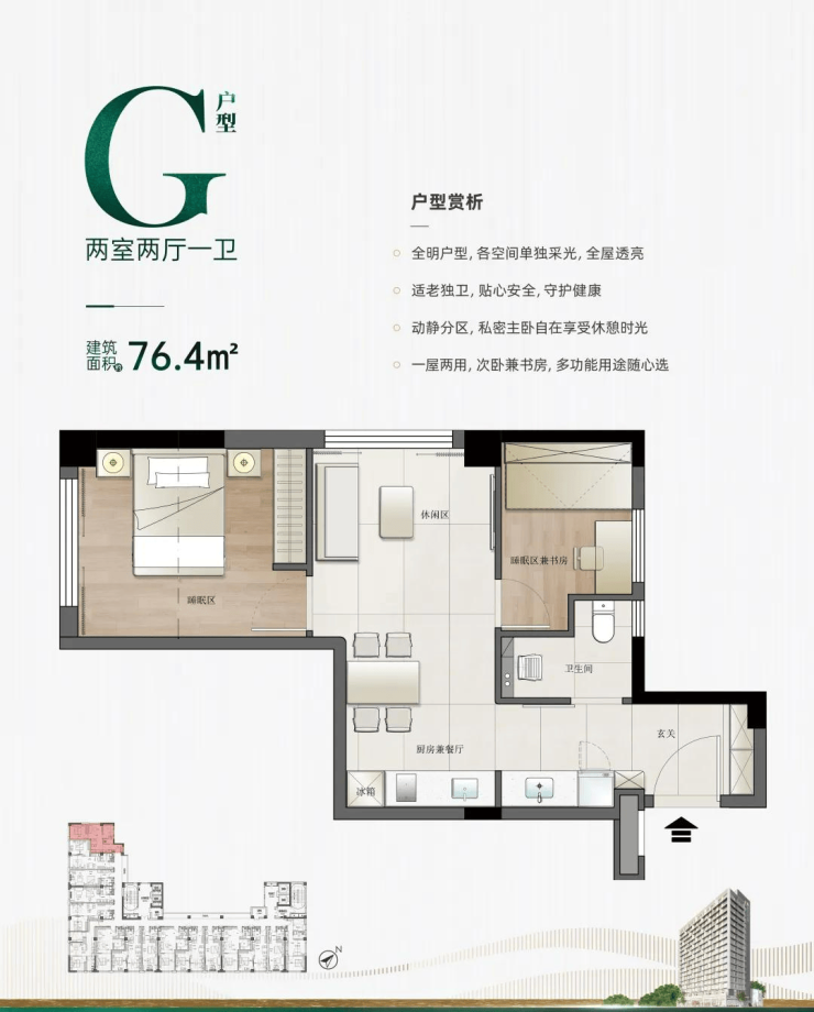 G户型(两室两厅一卫):建筑面积约76.4㎡