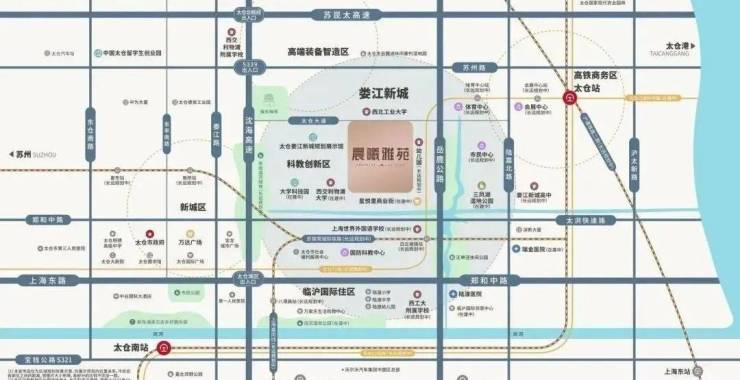 苏锡常城际铁路(在建中)及太仓T1(规划中)东西贯穿太仓新老城区,沿线规划体育中心、市民中心、会展中心等人文配套,项目距苏锡常城际铁路白云渡路站(规划中)、太仓T1线白云渡路站(规划中)仅约800米,交通畅达。