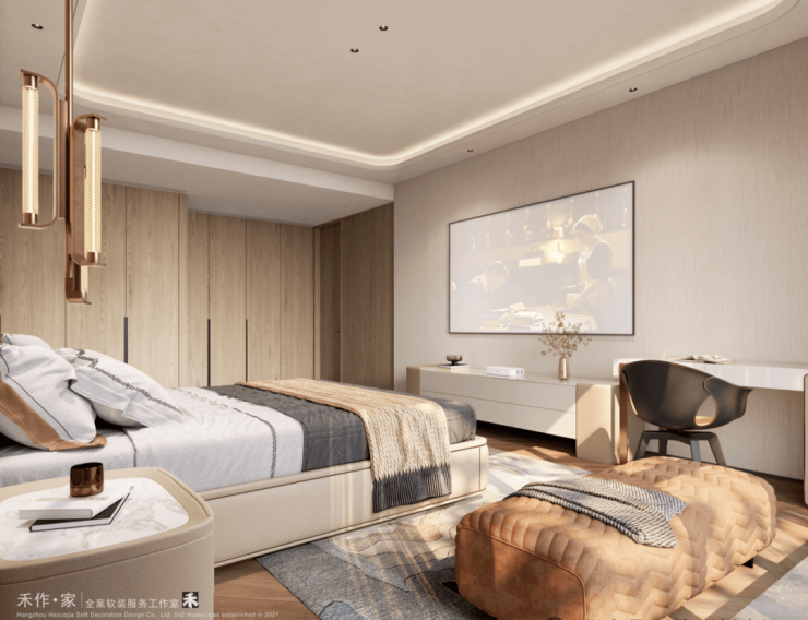 主卧中,Visionnaire Ripley 床架以低调奢华诠释休憩美学。深灰色真皮面料带着荔枝纹肌理,床头绗缝工艺暗藏对称美学,金属嵌条如精致腰带勾勒轮廓,与硬装艺术玻璃形成呼应。两侧悬浮床头柜轻盈悬空,玻璃台面与金属支架透着现代气息,柔和灯光洒在床品上,营造静谧安稳的睡眠氛围。
