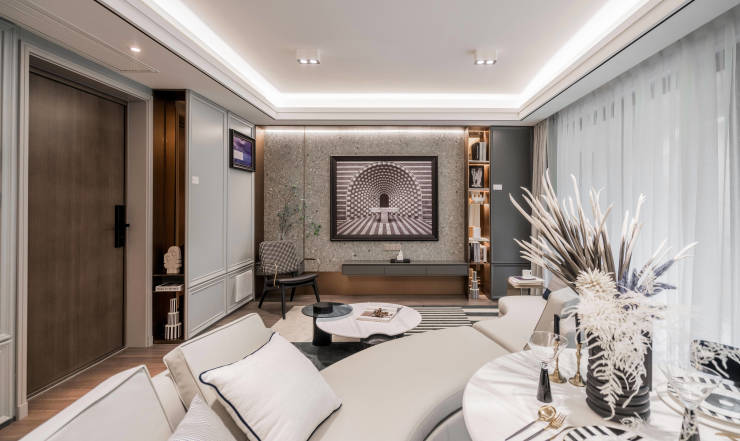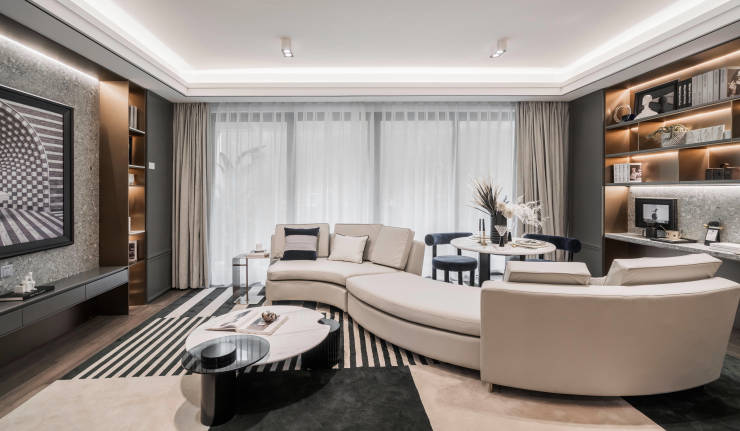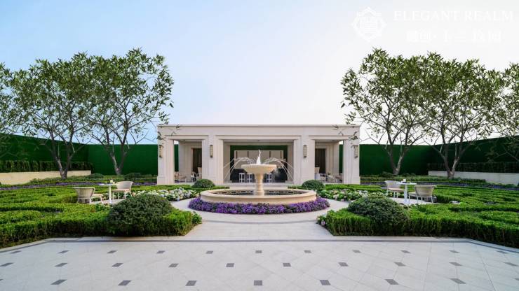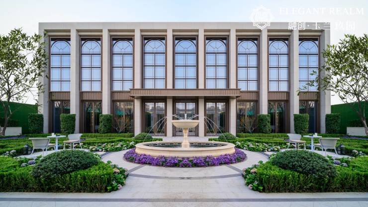 项目承袭融创玉兰系法式基因,以"巴黎/流动的盛宴"为景观叙事主线,将古典法式美学与现代生活需求相融合。建筑采用米白暖色系立面,糅合高级灰元素,呈现新古典主义风格,既保留法式建筑的对称庄重,又通过简化线条增强现代感。