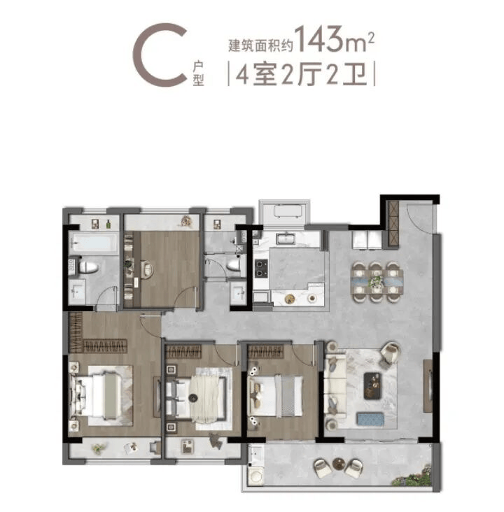 - 得房率75%以上 (143㎡户型实得约107㎡)