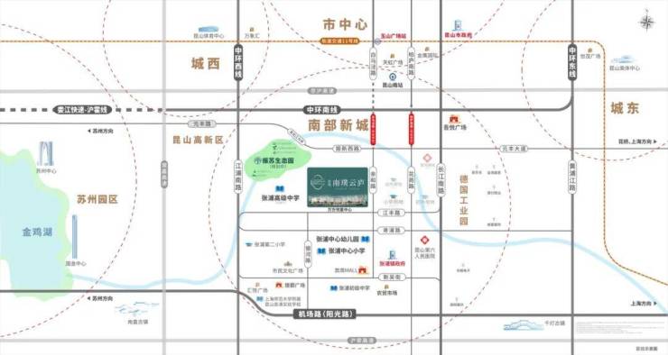 蓝城南璞云庐周边交通便利,1公里内有6个公交站(昆山232路、高峰7号线等),规划中的白马泾路南延段将连接亲和路,未来可快速通达昆山市区。主要交通节点包括: