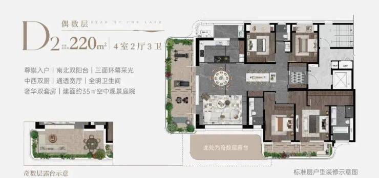 "一方云端庭院,让院落情结与现代技艺完美融合——约15-35㎡太湖空中院落,270°环幕揽湖光,6米挑高引清风,既是瑜伽观星的诗意栖居,亦是烧烤派对的社交主场,重构峯层生活的精神容器。"