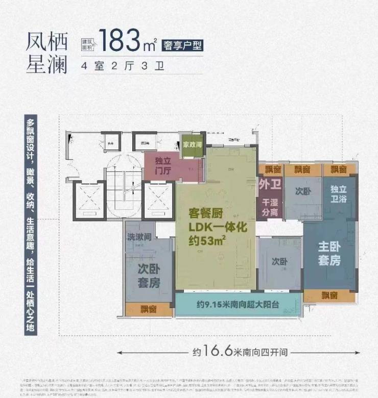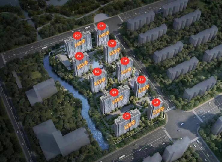 主力户型:128㎡三室两卫、148㎡三加一室、183㎡四室三卫,得房率82%-85%