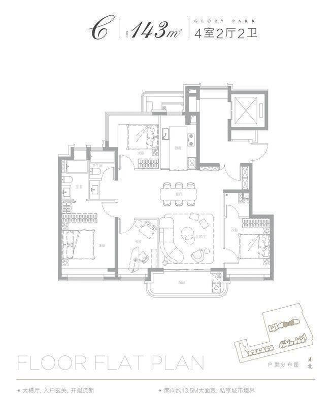 建面约 143㎡四房:四开间朝南,老人房与儿童房分置两端,主卧套房配备步入式衣帽间与观景飘窗,有可变空间。