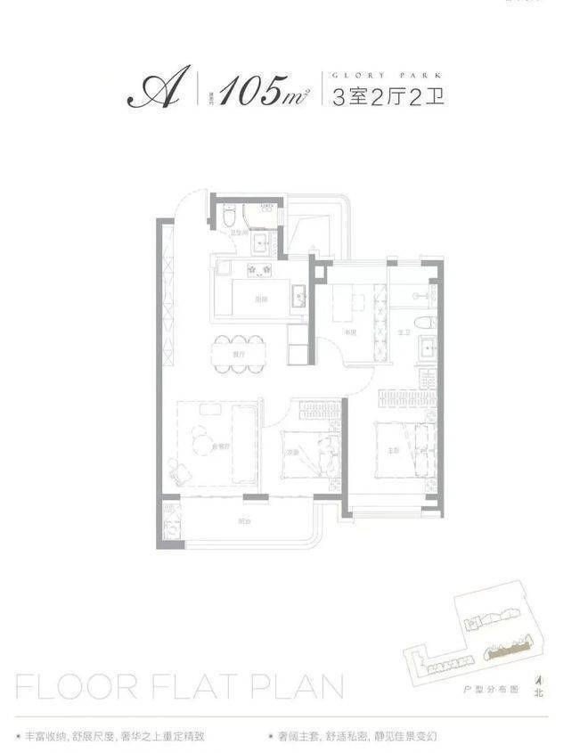 建面约 105㎡三房两厅两卫:采用经典南北通透格局,客厅开间约 4.2 米,搭配同等尺度景观阳台,三个卧室均带飘窗,主卧为独立套间,得房率高达 74.4%-79.3%。