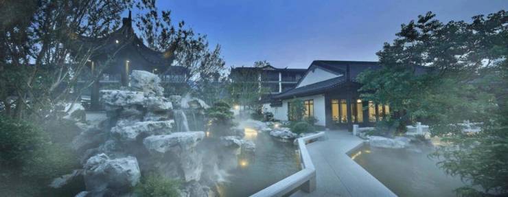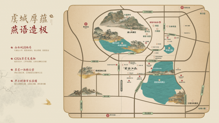 建筑风格:纯中式设计,复刻亭台楼阁、叠石水理等传统园林景观,形成“外揽一山三湖,内藏十园入景”的雅致格局