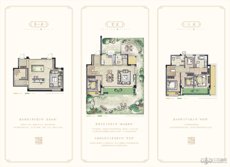 叠墅:下叠带南北双庭院及地下室,上叠设270°环檐露台;上叠五室两厅布局,上下双阳台设计