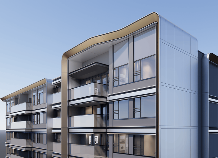 一园三堂的归家动线 ,象征着东方人文礼序。建筑风格造型,灵感源自金镶玉设计,提取其“曲”的形和白金配色应用到塔楼立面上,彰显项目的温和雅丽与尊贵典雅。