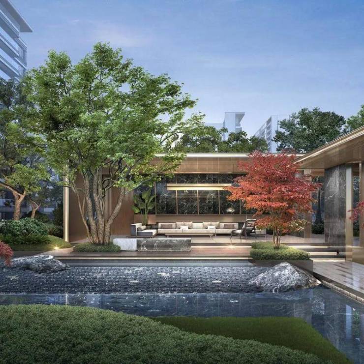 项目内部:35%–38%绿化率,打造“一湖三岛十二境”景观体系,中央镜面水景+智能光幕夜景