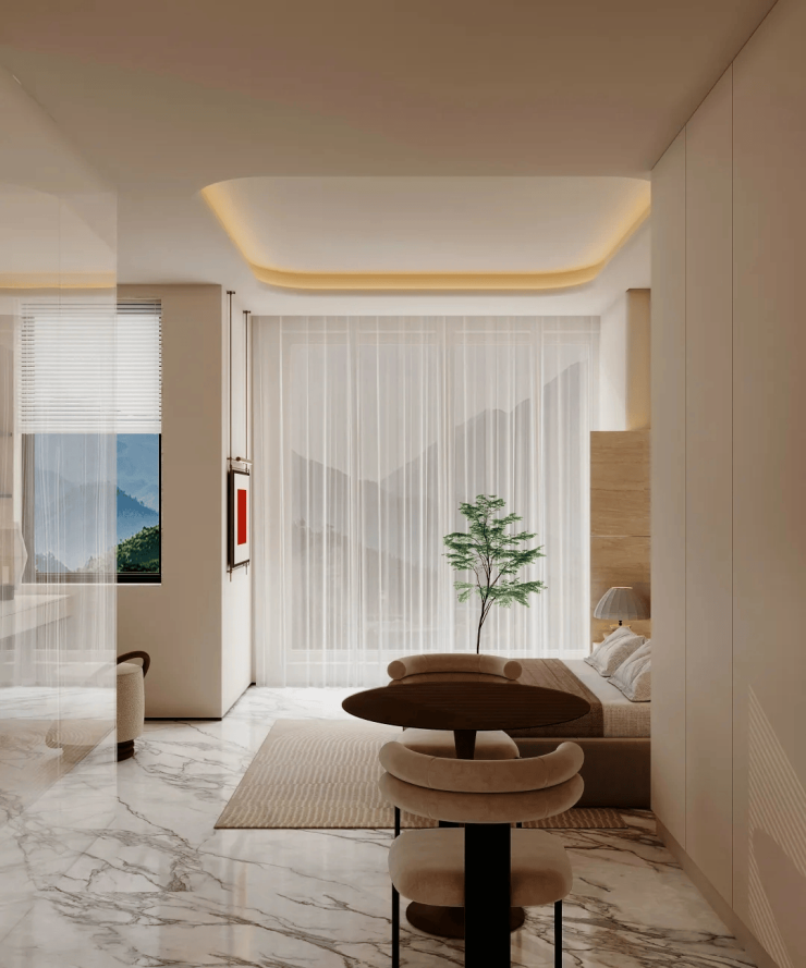 “立体化”空间哲学:6米层高配合全景落地窗,确保双层采光通风,上层可作为卧室或独立办公区,实现“一房变两房”的魔术级扩容。