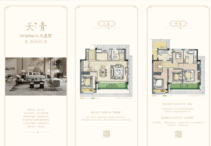 样板间展示:下叠253㎡户型拥有南北双庭院和5.2米挑高地下室;上叠169㎡户型为五室两厅,上下双阳台设计