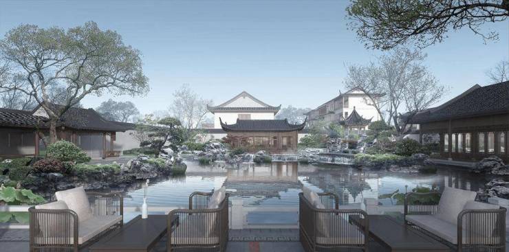 园林设计:以江南水乡园林为蓝本,集山水、街巷、庭院、礼制、园林五大意境于一体,打造纯正中式园林宅邸