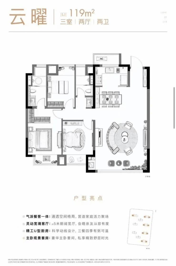 119㎡三室两厅两卫:升级版改善户型,主卧套房设计,配备独立衣帽间,南向面宽达10.8米,采光通风俱佳