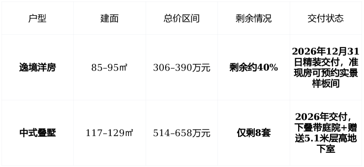 💰 在售情况:准现房交付,2026年底搬入,叠墅仅剩个位数