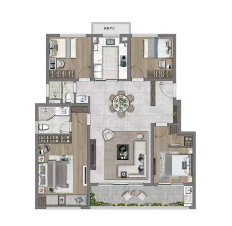 经典的 “四叶草” 户型设计,四个卧室分布于四个方位,相互独立又彼此贯通,保证家庭成员的私密空间。一个房间可作为老人房,方便老人起居;一个房间打造为儿童房,满足孩子成长需求;奢阔主卧套房犒赏主人,尺度感十足。三开间朝南,开间达约 4.4 米,进深约 7.2 米,让阳光、清风自由穿梭。餐客厅一体化设计,增强家庭成员之间的交流互动。南向约 7.3 米的双联阳台,可欣赏四季美景,享受悠闲时光。主卧面积约 23㎡,舒适阔绰,独立卫浴空间,让生活更具格调。