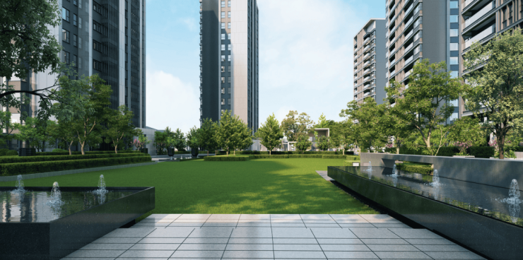 建筑西立面和阳台上方檐口用木纹铝板勾勒出古城屋檐的轻盈剪影,在复刻的「披檐」形制与花窗纹格里,触摸到传统与现代的共生密码,园林归家动线以镜面水景和几何光影演绎现代美学。正如一位业主所言:“这里不是‘占据’地段,而是让地段自然生长进生活。”