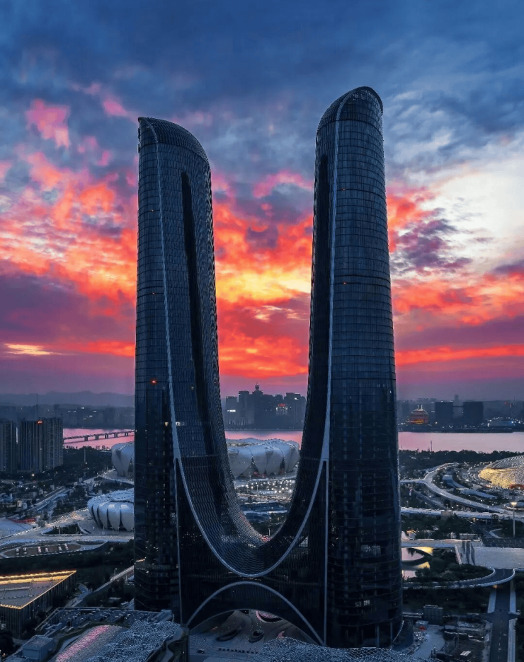 外立面 “丝绸流线”设计,灵感源自杭州织锦文化,玻璃幕墙如裙摆倾泻,夜间灯光极具辨识度