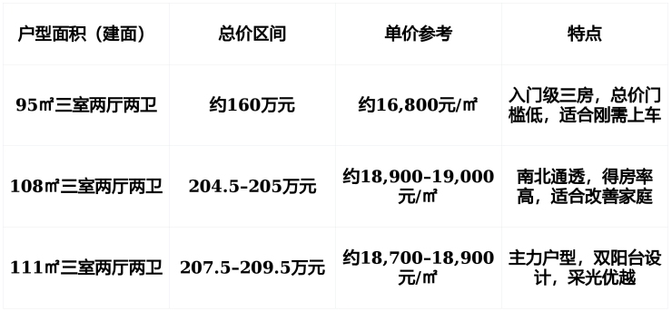 项目主力户型为建面约95–111㎡的三室两厅两卫,主打高性价比与空间实用性。