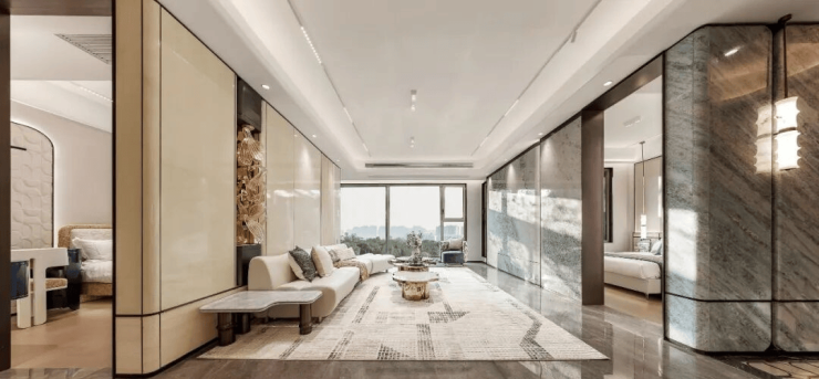 宋韵设计:实景示范区呈现三进七景园林、宋韵立面及地下恒温泳池会所。