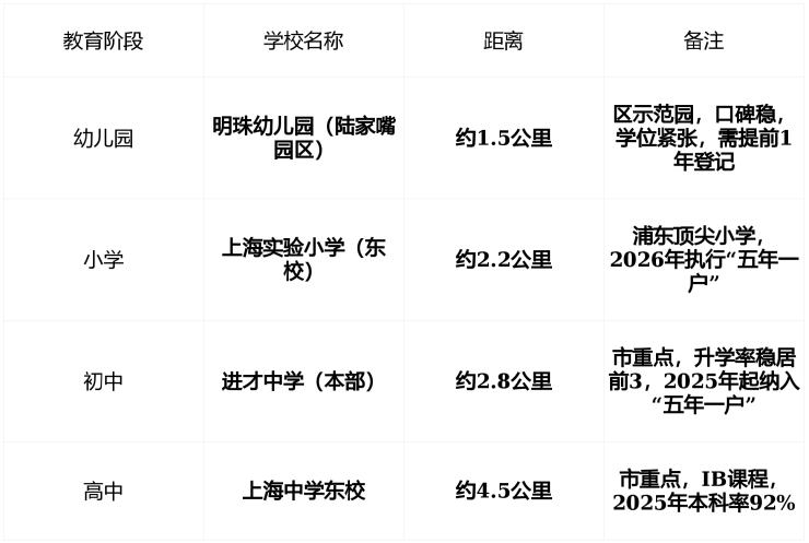 关键提示无对口划片,入学按“统筹分配”执行陆家嘴板块生源持续饱和,建议购房前完成户籍迁入+实际居住满2年