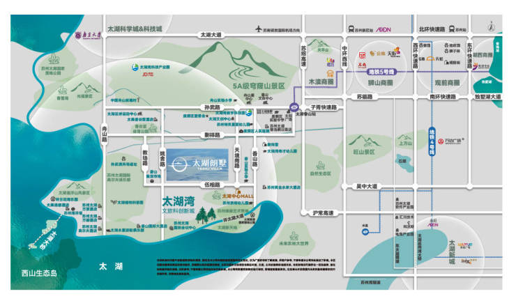 项目位于太湖度假区核心位置,距离太湖仅约1公里,背靠穹窿山5A景区,三面环水,生态资源得天独厚