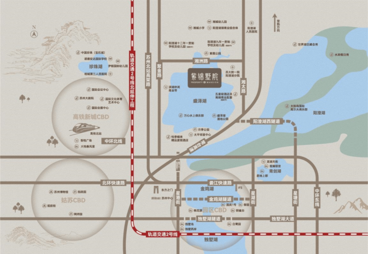 项目位于相城区阳澄湖镇湘州路199号,地处北双湖板块核心,距苏州高铁北站仅10分钟车程,30分钟可达园区主城1。相城区正推进"大疏大密"规划,高铁新城将打造为立体通达的城市空间