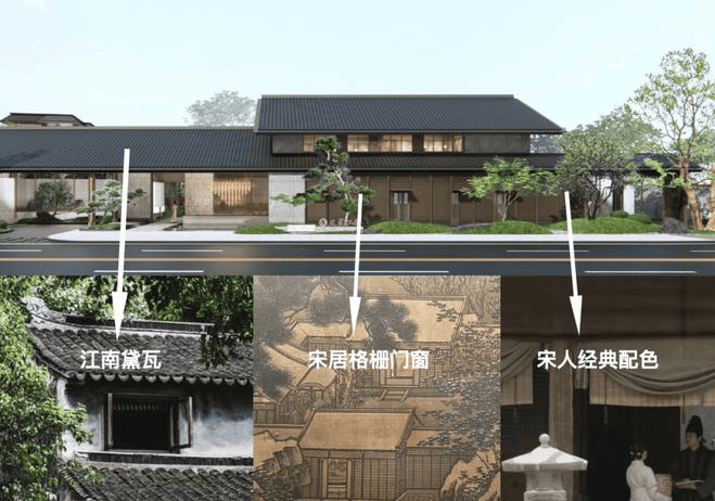 宋风与江南园林融合:项目大门采用江南宋风府门设计,融入香山帮非遗工艺(如细石匠、回纹雕刻)