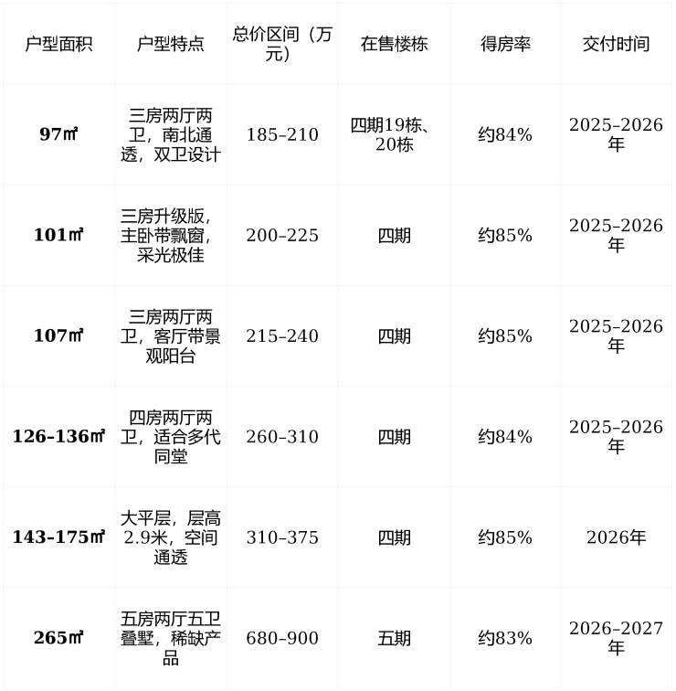 温馨提示 :97–136㎡主力户型仍热销,265㎡叠墅仅剩数套,建议优先锁定 南向、近岛心湖 房源。